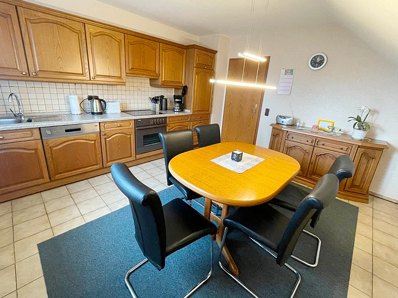 Die gut eingerichtete Küche ist ausgestattet mit Kühlschrank, Spülmaschine, Backofen mit Cerankochfeld, Kaffeemaschine, Toaster und Wasserkocher.